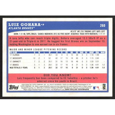 This is a 2018 Topps Big League Gold Luiz Gohara baseball card. The card is #260 and pictures show condition. Team(s): Atlanta Braves Rookie Card (RC)
