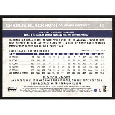 This is a 2018 Topps Big League Players Weekend Photo Variations Charlie Blackmon baseball card. The card is #117 and pictures show condition. Team(s): Colorado Rockies