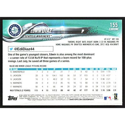 This is a 2018 Topps Chrome Edwin Diaz baseball card. The card is #155 and pictures show condition.