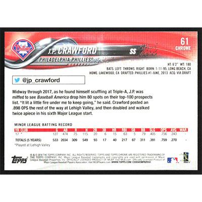 This is a 2018 Topps Chrome J.P. Crawford baseball card. The card is #61 and pictures show condition. Team(s): Philadelphia Phillies Rookie Card (RC)