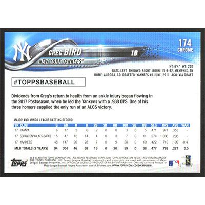 This is a 2018 Topps Chrome Black and White Negative Refractors Greg Bird baseball card. The card is #174 and pictures show condition. Team(s): New York Yankees