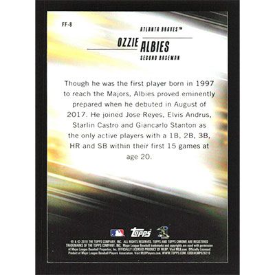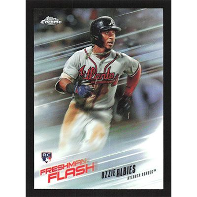 This is a 2018 Topps Chrome Freshman Flash Refractors Ozzie Albies baseball card. The card is #FF-8 and pictures show condition. Team(s): Atlanta Braves Rookie Card (RC)