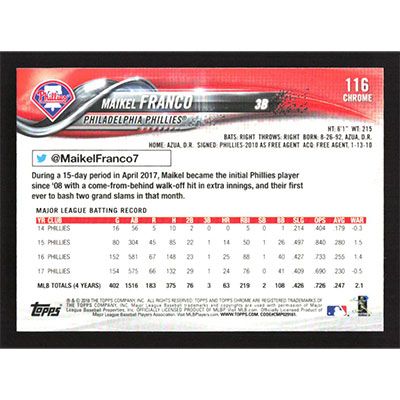 This is a 2018 Topps Chrome Prism Refractors Maikel Franco baseball card. The card is #116 and pictures show condition.