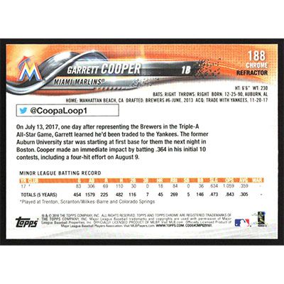 This is a 2018 Topps Chrome Refractors Garrett Cooper baseball card. The card is #188 and pictures show condition. Team(s): Miami Marlins Rookie Card (RC)