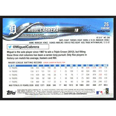 This is a 2018 Topps Chrome Refractors Miguel Cabrera baseball card. The card is #26 and pictures show condition.