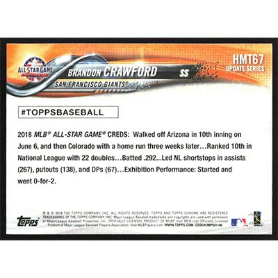 This is a 2018 Topps Chrome Update Brandon Crawford All-Star baseball card. The card is #HMT67 and pictures show condition.