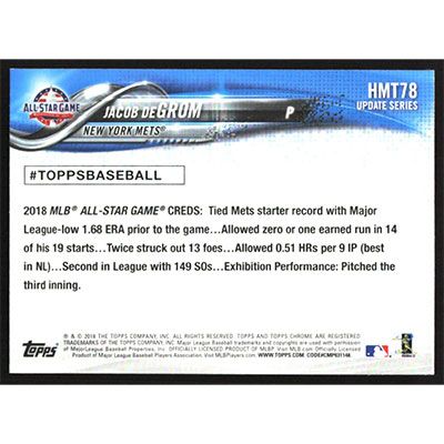 This is a 2018 Topps Chrome Update Jacob deGrom All-Star baseball card. The card is #HMT78 and pictures show condition.
