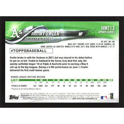This is a 2018 Topps Chrome Update Pink Refractors Dustin Fowler baseball card. The card is #HMT13 and pictures show condition. Team(s): Oakland Athletics Rookie Card (RC)