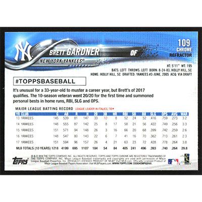 This is a 2018 Topps Chrome X-Fractors Brett Gardner baseball card. The card is #109 and pictures show condition.