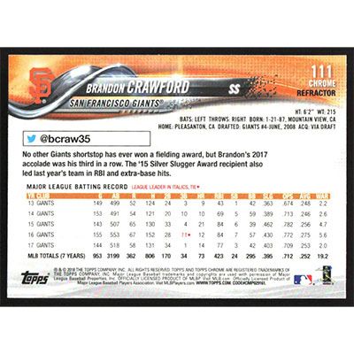 This is a 2018 Topps Chrome X-Fractors Brandon Crawford baseball card. The card is #111 and pictures show condition.