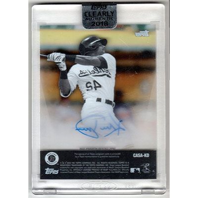 This is a 2018 Topps Clearly Authentic Salute Autographs Khris Davis autographed baseball card. This card has been signed, in blue, by Khris Davis, and is certified authentic byTopps. The card is #CASA-KD and pictures show condition.