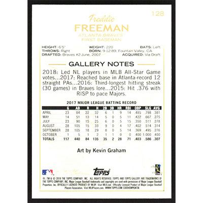 This is a 2018 Topps Gallery Freddie Freeman baseball card. The card is #128 and pictures show condition.