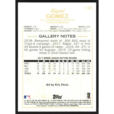 This is a 2018 Topps Gallery Miguel Gomez baseball card. The card is #135 and pictures show condition. Team(s): San Francisco Giants Rookie Card (RC)