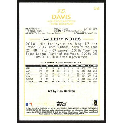 This is a 2018 Topps Gallery J.D. Davis baseball card. The card is #58 and pictures show condition.