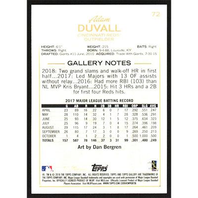 This is a 2018 Topps Gallery Adam Duvall baseball card. The card is #72 and pictures show condition.