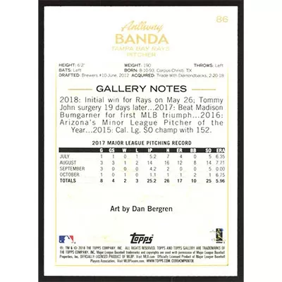 This is a 2018 Topps Gallery Canvas Anthony Banda baseball card. The card is #86 and pictures show condition. Team(s): Tampa Bay Rays Rookie Card (RC)