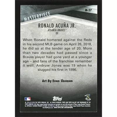 This is a 2018 Topps Gallery Masterpiece Ronald Acuña Jr. baseball card. The card is #M-27 and pictures show condition. Team(s): Atlanta Braves Rookie Card (RC)