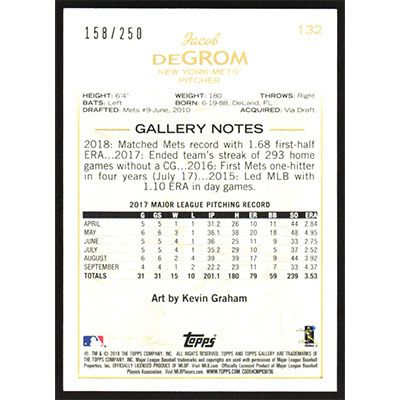 This is a 2018 Topps Gallery Private Issue Jacob deGrom baseball card. The card is #132 and pictures show condition. This card is limited; #'d 158/250.