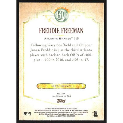 This is a 2018 Topps Gypsy Queen Missing Blackplate Freddie Freeman baseball card. The card is #264 and pictures show condition.