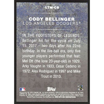 This is a 2018 Topps Legends in the Making Cody Bellinger baseball card. The card is #LTM-CB and pictures show condition.