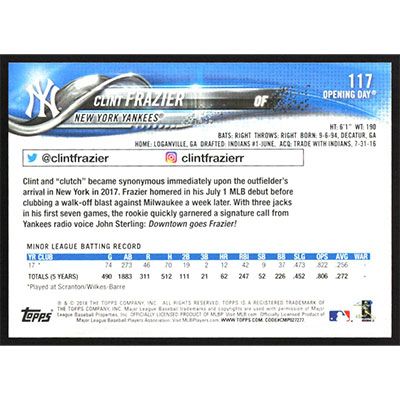 This is a 2018 Topps Opening Day Clint Frazier baseball card. The card is #117 and pictures show condition. Team(s): New York Yankees Rookie Card (RC)
