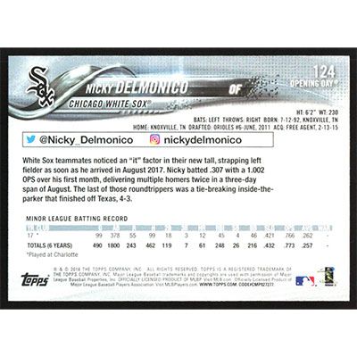 This is a 2018 Topps Opening Day Blue Foil Nicky Delmonico baseball card. The card is #124 and pictures show condition. Team(s): Chicago White Sox Rookie Card (RC)