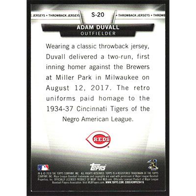 This is a 2018 Topps Salute Series 2 Adam Duvall baseball card. The card is #S-20 and pictures show condition.