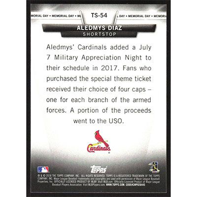 This is a 2018 Topps Salute Aledmys Diaz baseball card. The card is #TS-54 and pictures show condition.