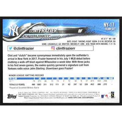 This is a 2018 Topps Team Sets Clint Frazier baseball card. The card is #NY-17 and pictures show condition. Team(s): New York Yankees Rookie Card (RC)