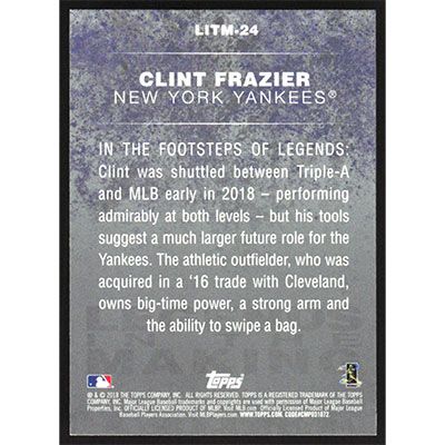 This is a 2018 Topps Update Legends in the Making Clint Frazier baseball card. The card is #LITM-24 and pictures show condition. Team(s): New York Yankees Rookie Card (RC)