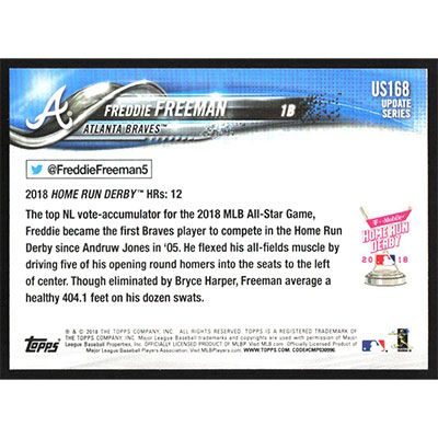 This is a 2018 Topps Update Freddie Freeman Home Run Derby baseball card. The card is #US168 and pictures show condition.