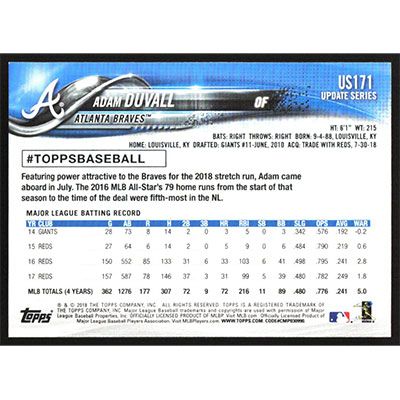 This is a 2018 Topps Update Adam Duvall autographed baseball card. This card has been signed, in blue, by Adam Duvall, and is guaranteed authentic by Ballcardz.com. The card is #US171 and pictures show condition.