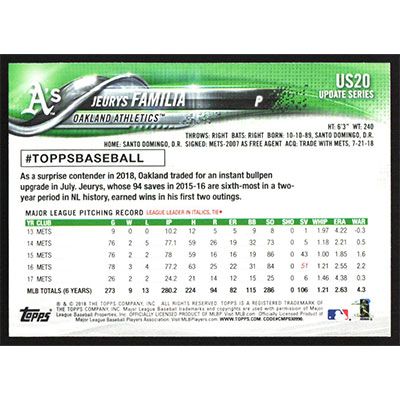This is a 2018 Topps Update Jeurys Familia baseball card. The card is #US20A and pictures show condition.