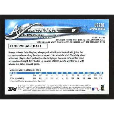 This is a 2018 Topps Update Ronald Acuña Jr. baseball card. The card is #US250 and pictures show condition.