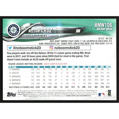 This is a 2018 Topps Wal-Mart Holiday Snowflake Nelson Cruz baseball card. The card is #HMW106 and pictures show condition.