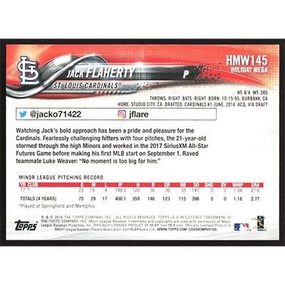 This is a 2018 Topps Wal-Mart Holiday Snowflake Jack Flaherty baseball card. The card is #HMW145 and pictures show condition. Team(s): St. Louis Cardinals Rookie Card (RC)
