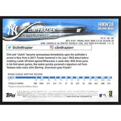 This is a 2018 Topps Wal-Mart Holiday Snowflake Clint Frazier baseball card. The card is #HMW38 and pictures show condition. Team(s): New York Yankees Rookie Card (RC)