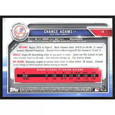 This is a 2019 Bowman Chrome Chance Adams baseball card. The card is #16 and pictures show condition.