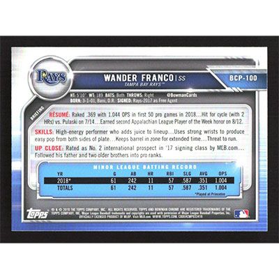 This is a 2019 Bowman Chrome Mega Box Prospects Refractors Wander Franco baseball card. The card is #BCP-100 and pictures show condition. Team(s): Tampa Bay Rays