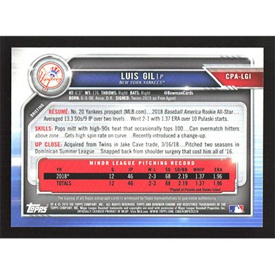 This is a 2019 Bowman Chrome Prospects Autographs Luis Gil autographed baseball card. This card has been signed, in blue, by Luis Gil, and is certified authentic by Topps. The card is #CPA-LGI and pictures show condition.