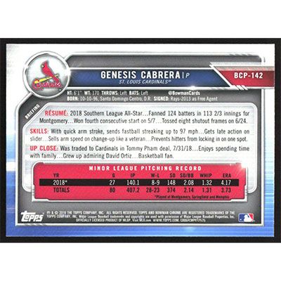 This is a 2019 Bowman Chrome Prospects Genesis Cabrera baseball card. The card is #BCP-142 and pictures show condition.