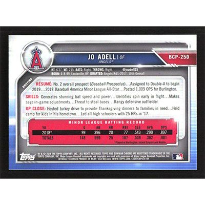 This is a 2019 Bowman Chrome Prospects Jo Adell autographed baseball card. This card has been signed, in blue, by Jo Adell, and is guaranteed authentic by Ballcardz.com. The card is #BCP-250 and pictures show condition.