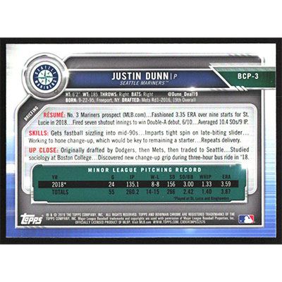 This is a 2019 Bowman Chrome Prospects Justin Dunn baseball card. The card is #BCP-3 and pictures show condition.