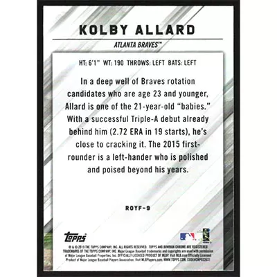 This is a 2019 Bowman Chrome Rookie of the Year Favorites Kolby Allard baseball card. The card is #ROYF-9 and pictures show condition. Team(s): Atlanta Braves Rookie Card (RC)