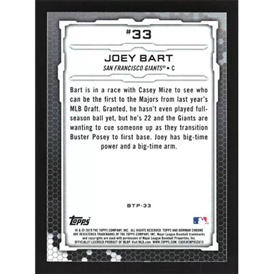 This is a 2019 Bowman Chrome Scouts Top 100 Joey Bart baseball card. The card is #BTP-33 and pictures show condition.