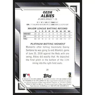 This is a 2019 Bowman Platinum Ozzie Albies baseball card. The card is #21 and pictures show condition.