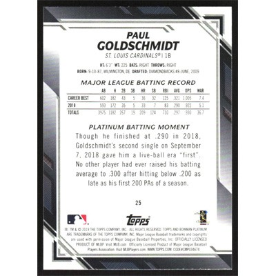 This is a 2019 Bowman Platinum Paul Goldschmidt baseball card. The card is #25 and pictures show condition.