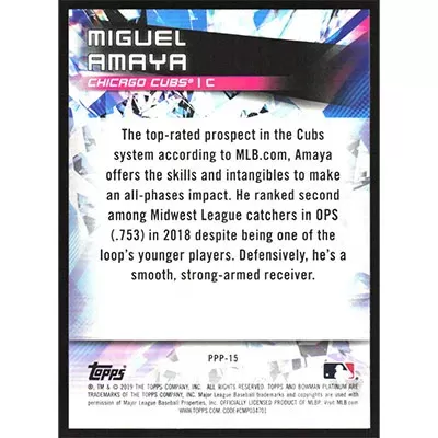 This is a 2019 Bowman Platinum Prismatic Prodigies Miguel Amaya baseball card. The card is #PPP-15 and pictures show condition.