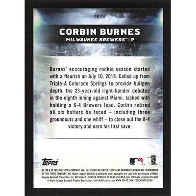 This is a 2019 Bowman Platinum Renowned Rookies Corbin Burnes baseball card. The card is #RR-14 and pictures show condition. Team(s): Milwaukee Brewers Rookie Card (RC)