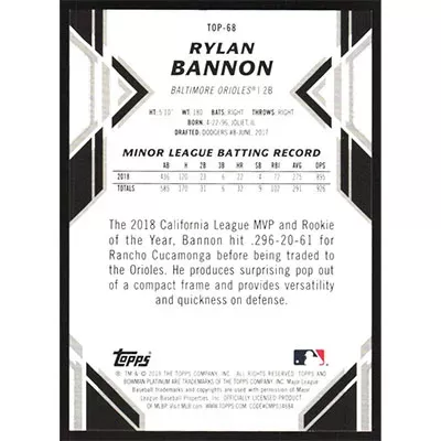 This is a 2019 Bowman Platinum Top Prospects Purple Rylan Bannon baseball card. The card is #TOP-68 and pictures show condition. This card is limited; #'d 118/250.